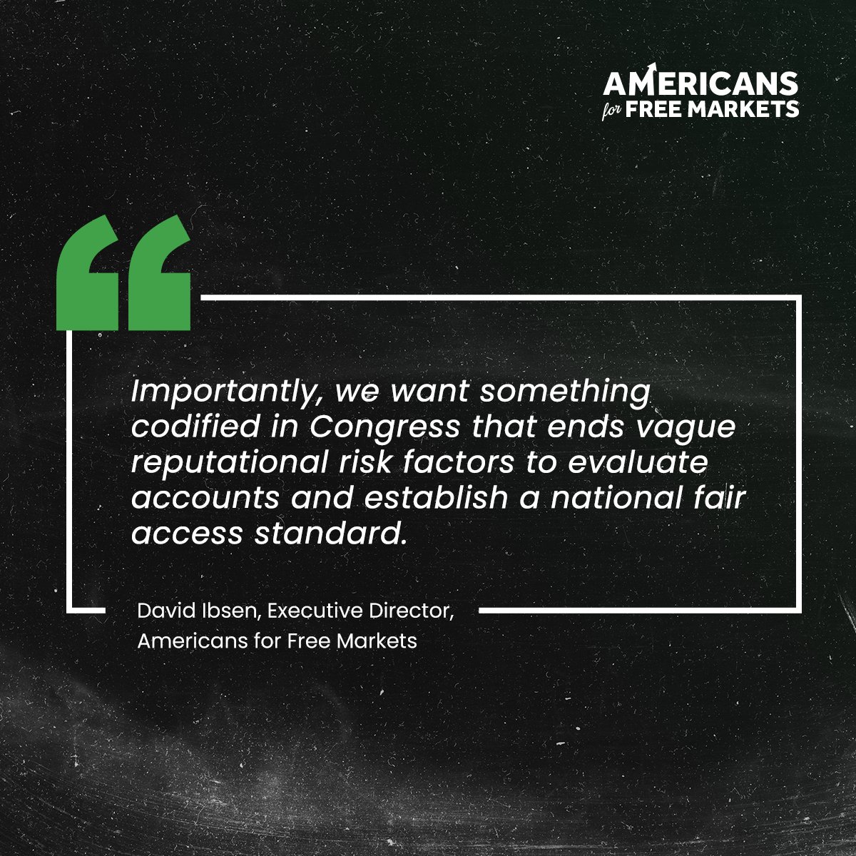 Americans for Free Markets (AFFM) is a coalition of groups in support of free markets and economic growth. AFFM recognizes that a strong banking and financial system, free from governmental interference and political motives, is the backbone of a robust free market and a prosperous, thriving economy; critical to our national security; and instrumental in advancing American competitiveness around the world. We advocate for policies that empower businesses to make decisions in the best interest of their customers and shareholders without fear of government micromanagement or retribution.